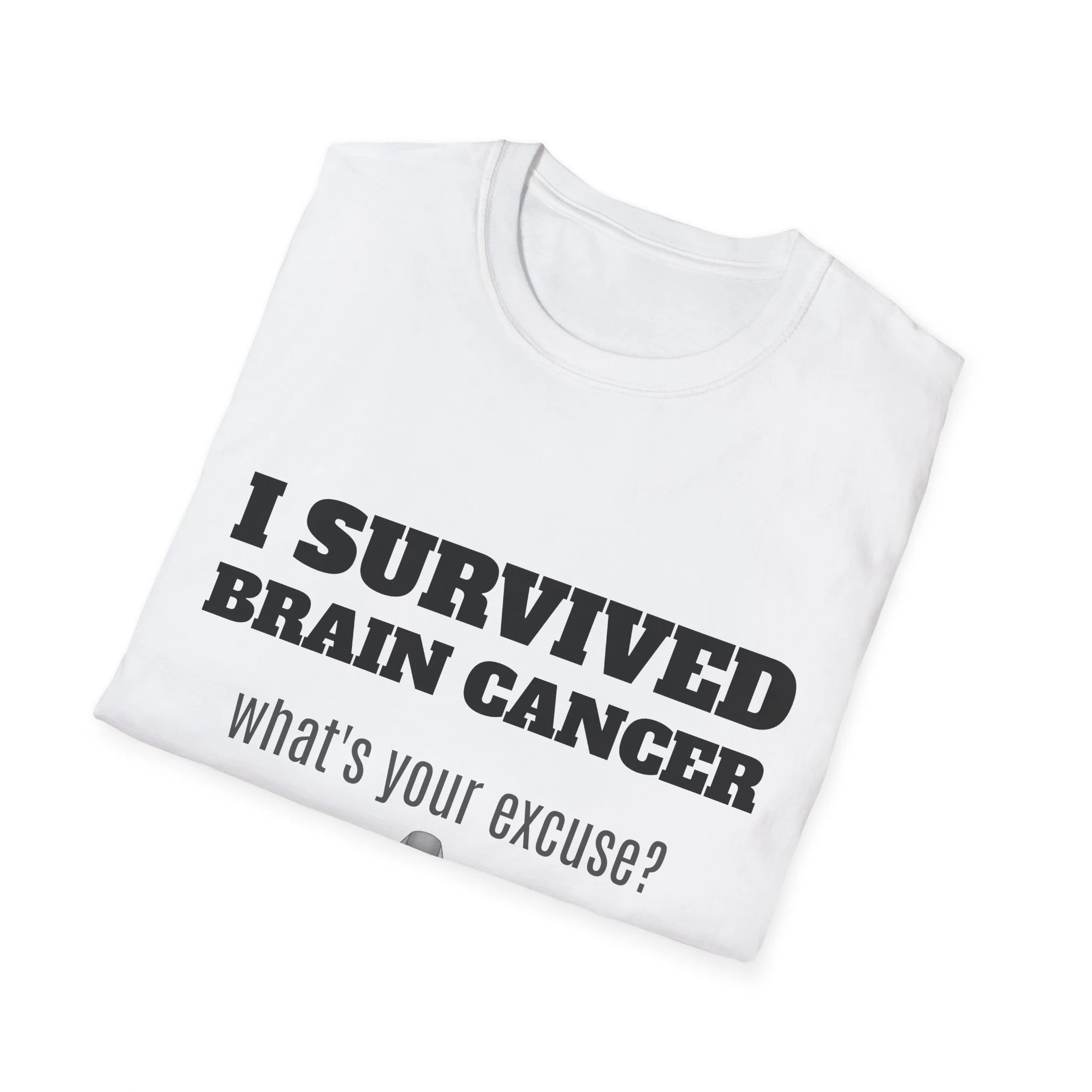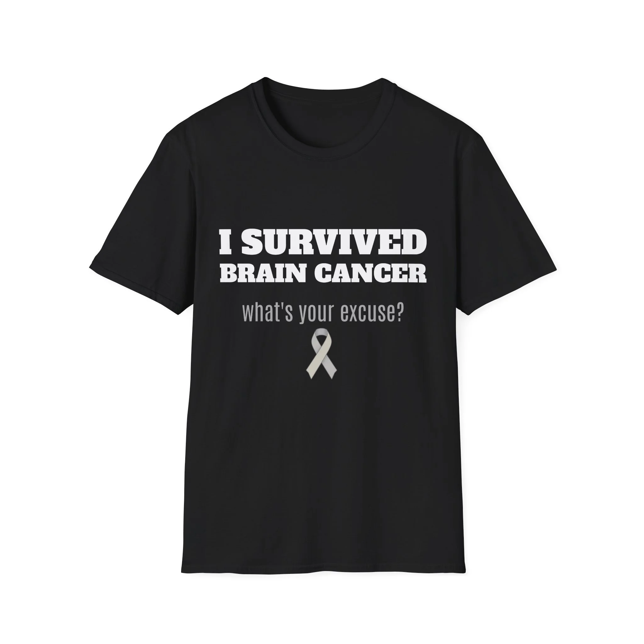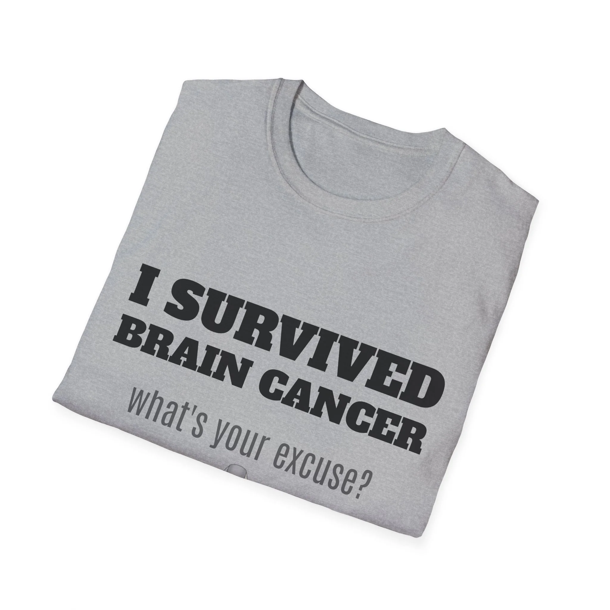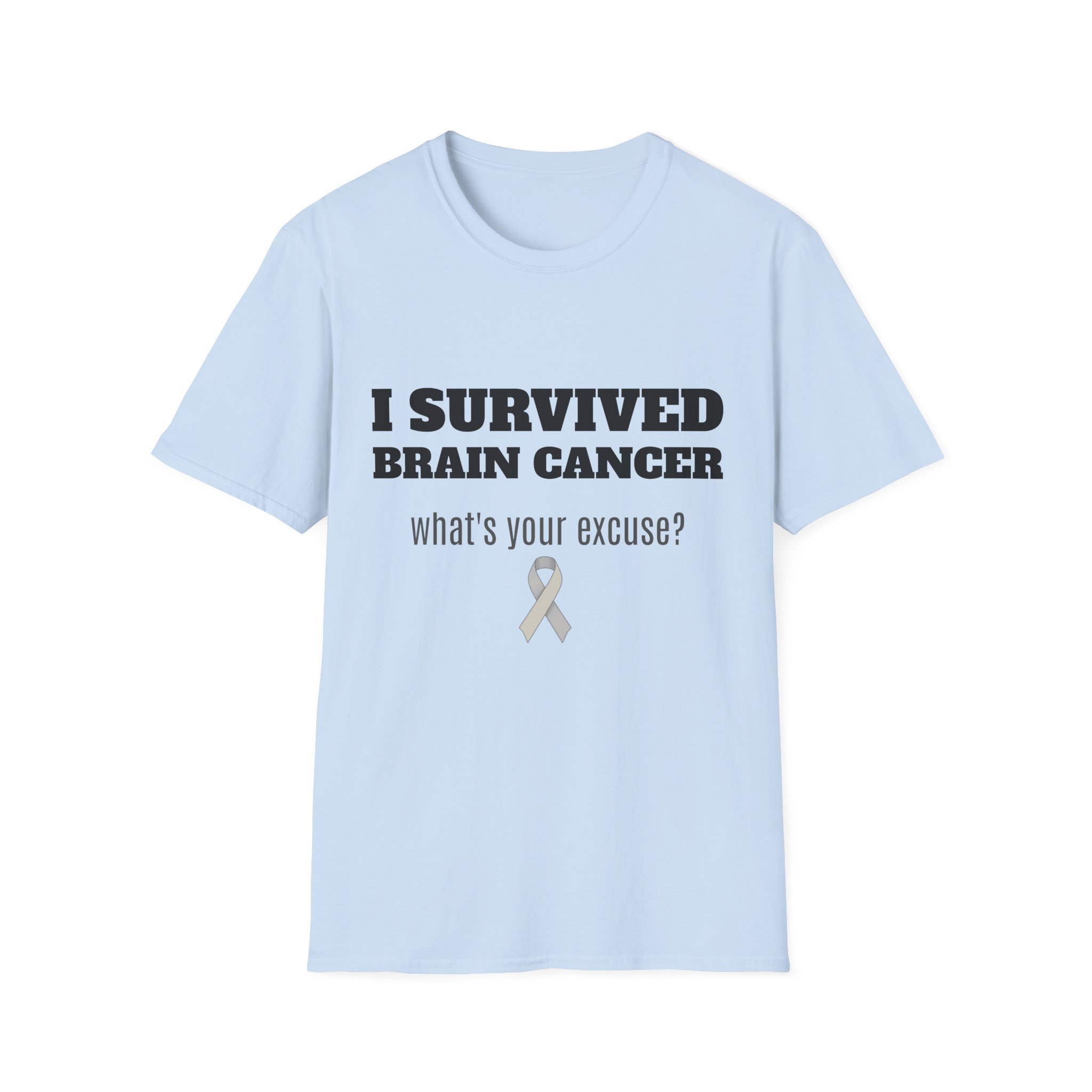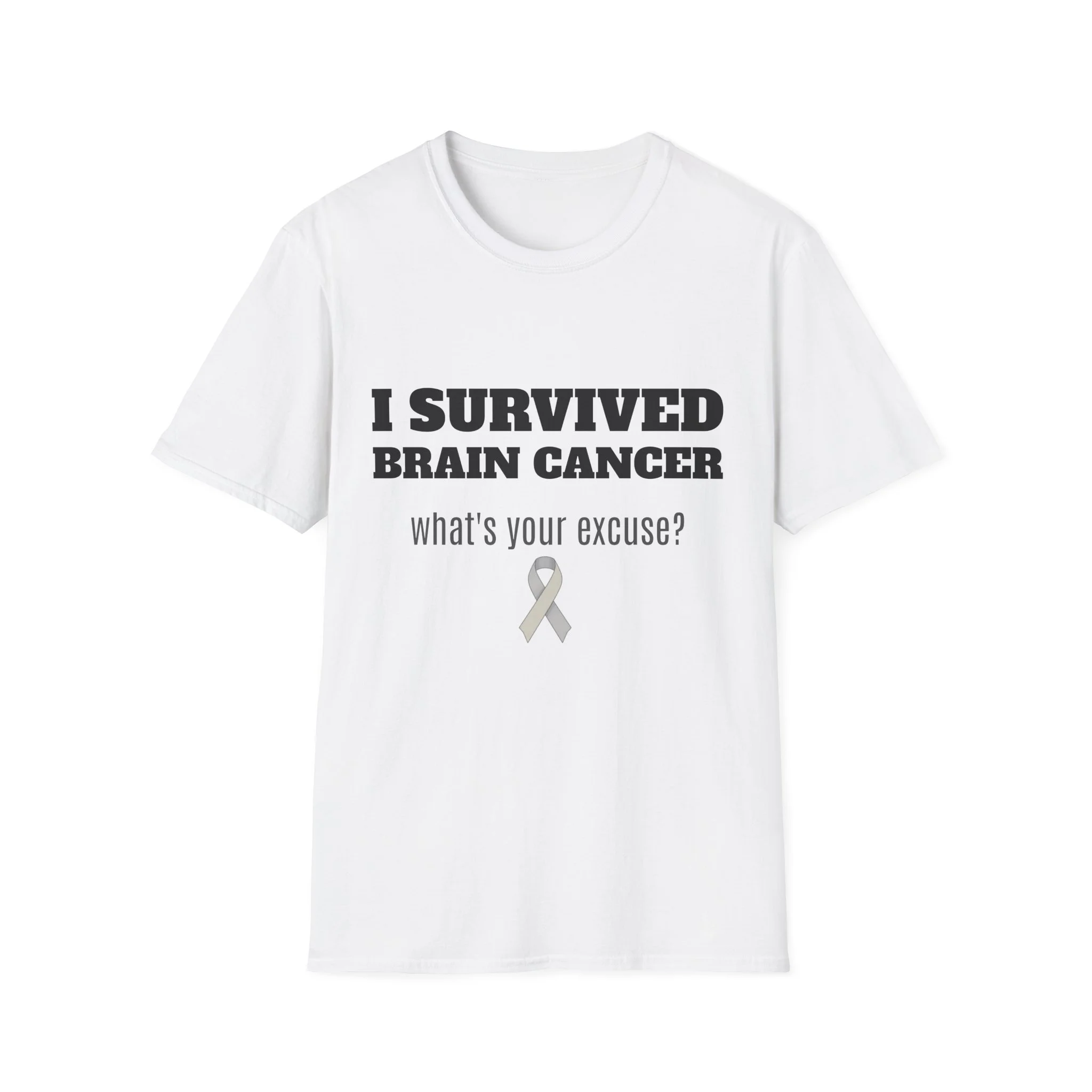 This lightweight, soft cotton tee carries a quiet but powerful message. The clean crew neck and classic fit make it a comfortable layer for days when you want your story to speak without shouting. A subtle gray awareness ribbon and bold text sit on the chest — worn by someone who’s come through a life-changing fight and now moves forward with confidence. It pairs easily with jeans or a zip hoodie for recovery appointments, casual meetups, or days when you want to acknowledge what you’ve been through without explaining it. Breathable, durable, and finished with a tear-away label, this shirt keeps the focus on living well and showing strength in everyday moments.