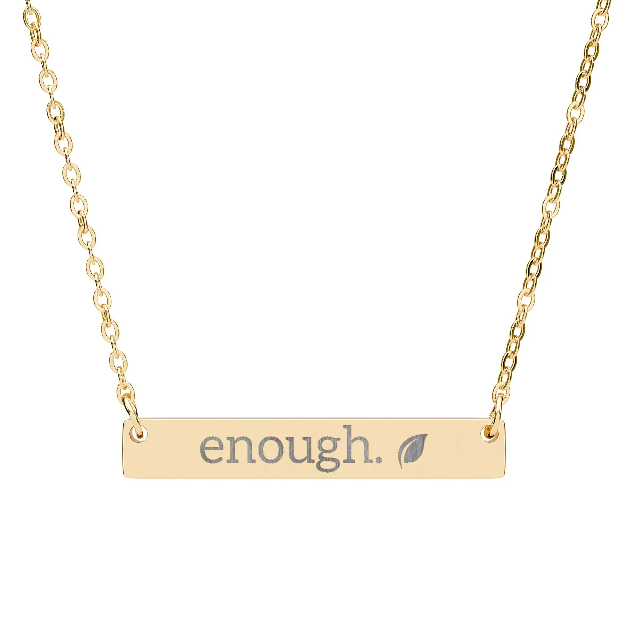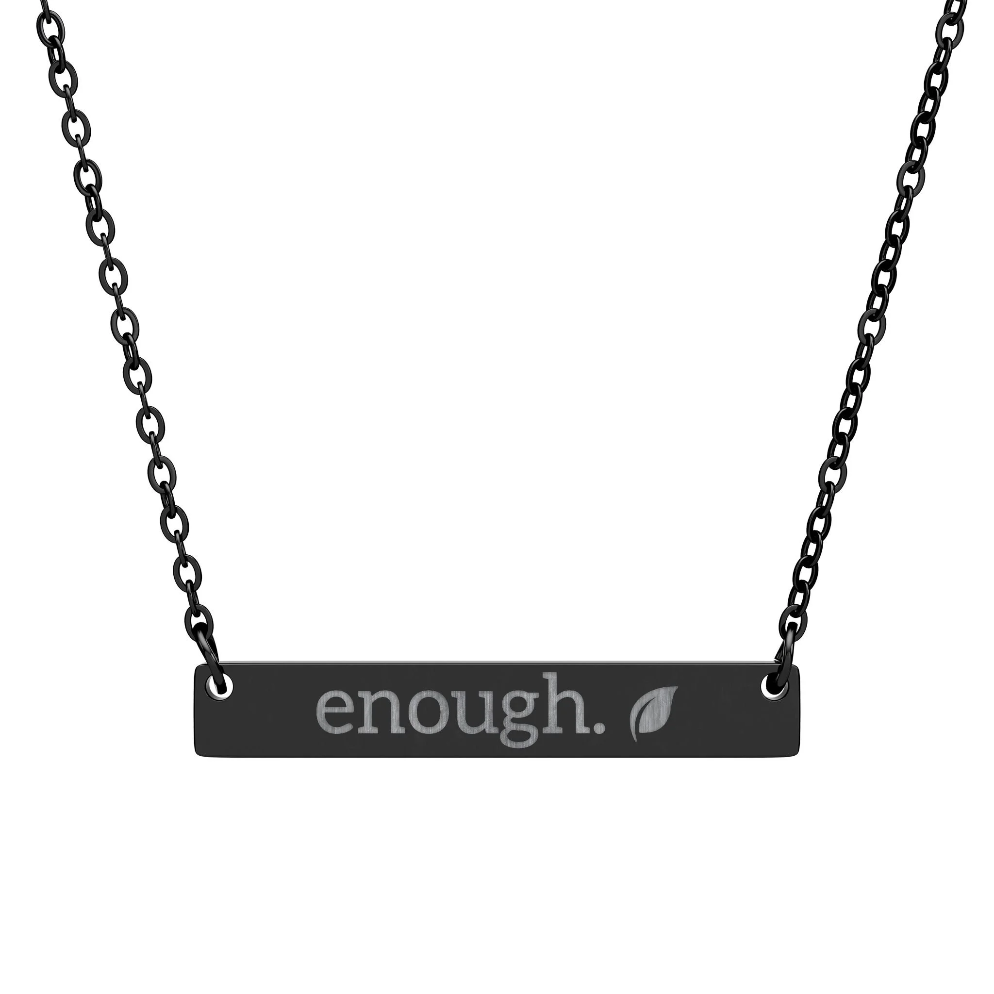The slim stainless-steel bar necklace sits low on the chest, laser-engraved with the message. Its surgical grade 316L construction and PVD coating options give a polished, lasting finish that resists rust and wear. Lightweight and hypoallergenic, it wears comfortably all day — a small reminder of I am enough, I am doing enough. Comes in classic silver or bold black for a look that slips easily into layered jewelry or stands alone as a focused statement.