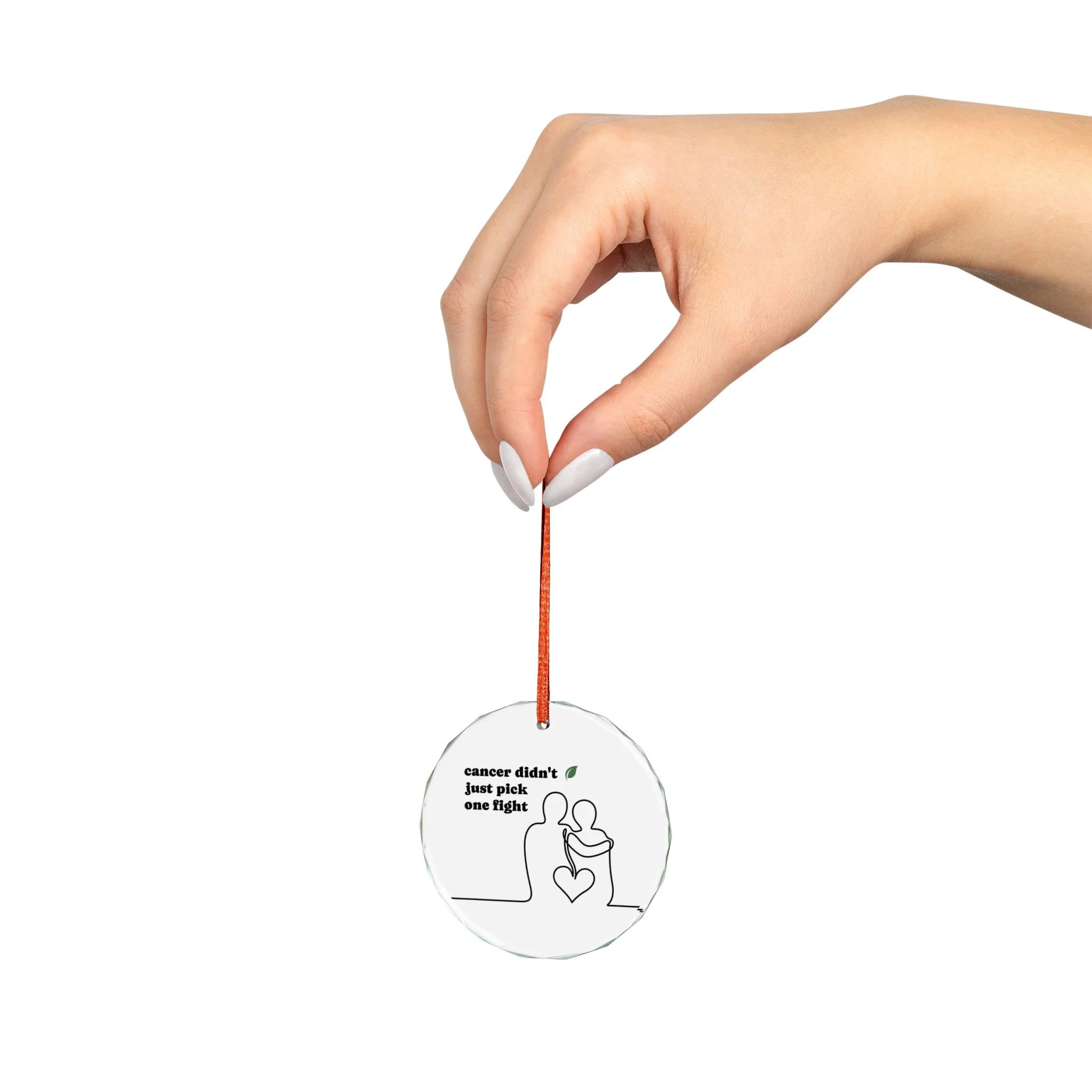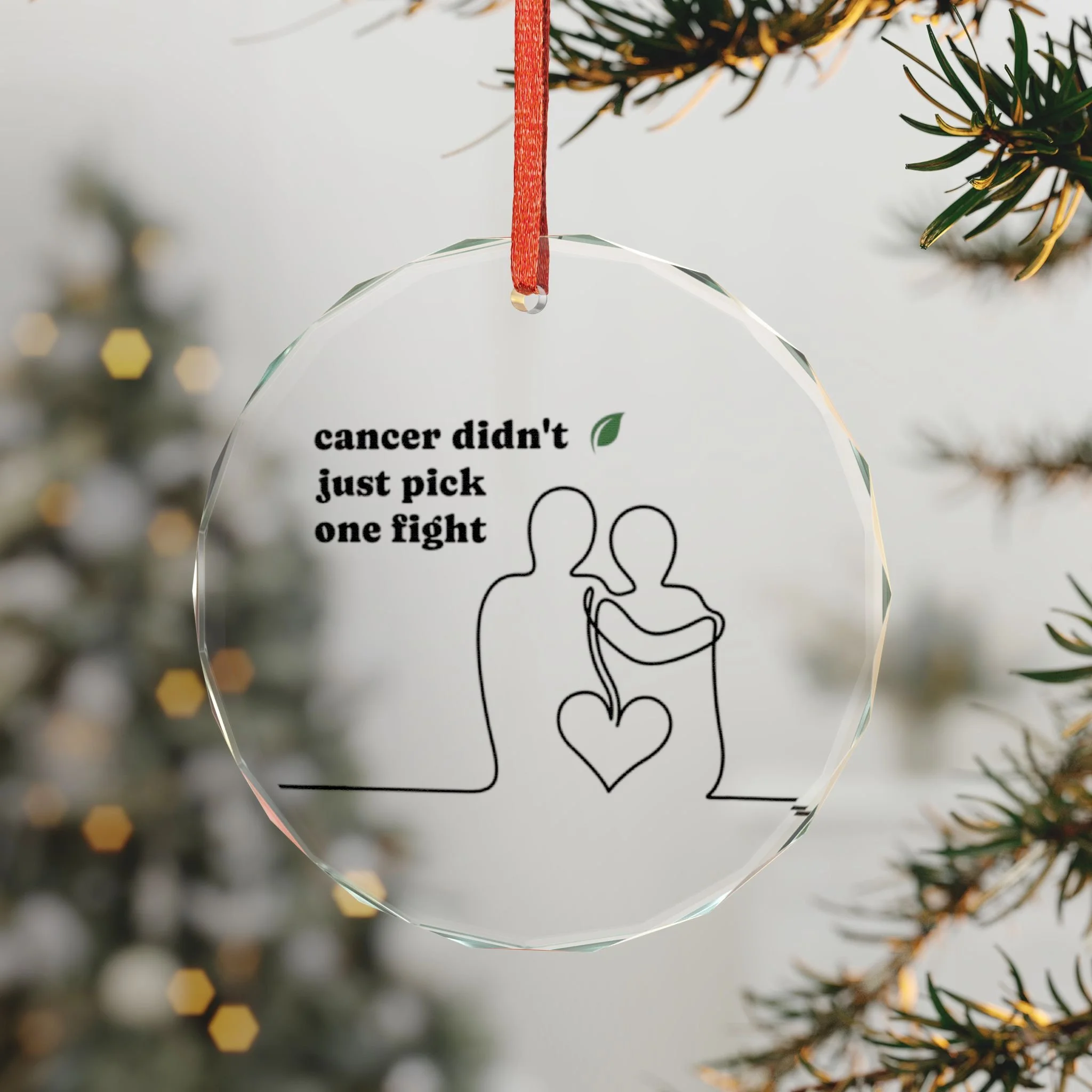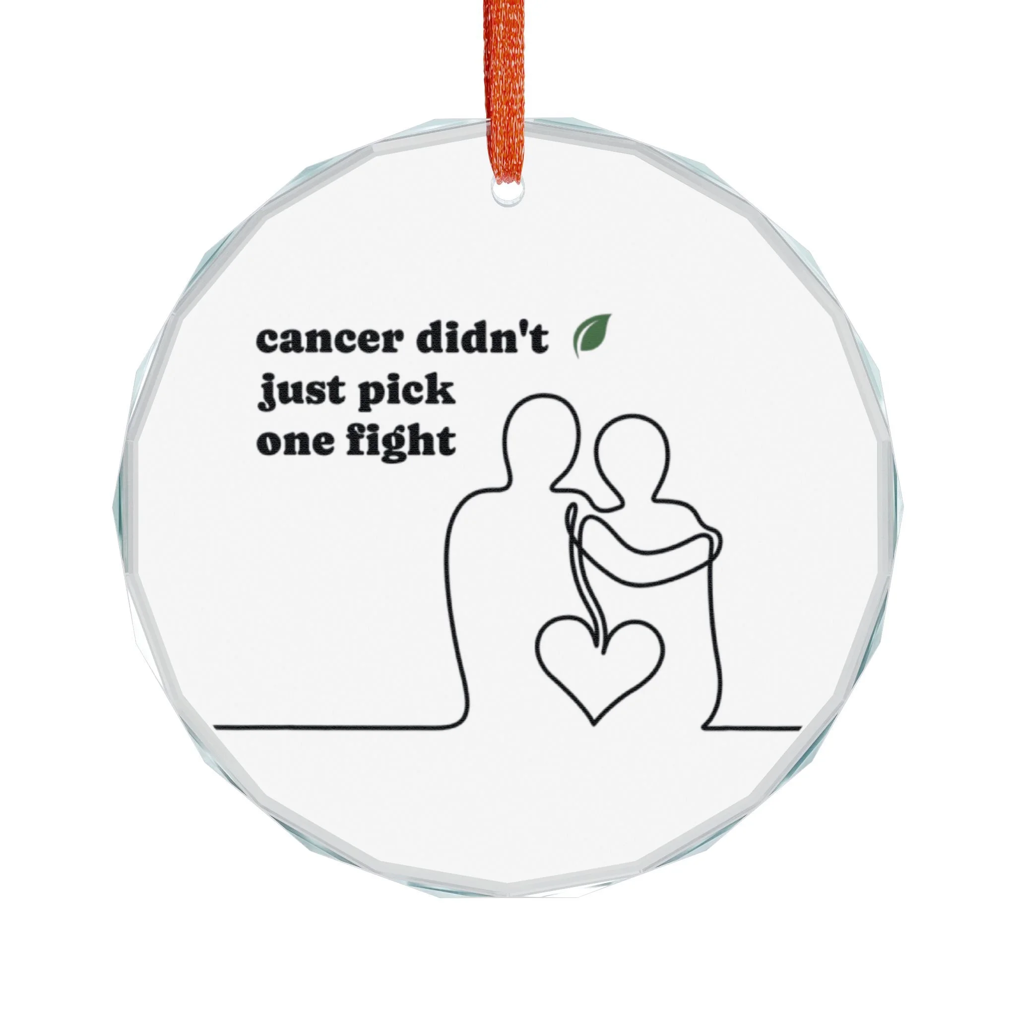 A clear crystal ornament that carries quiet strength. This 3" round keepsake captures a single-line silhouette of two figures holding a heart. Hang it where light can catch the facets — the white backing makes the design crisp, while the red ribbon adds a warm, hopeful touch. It reads as a tribute or a reminder: resilience shown gently, presence honored openly. Place it on a tree, in a window, or tucked into a memory corner to mark survival, solidarity, and quiet courage.