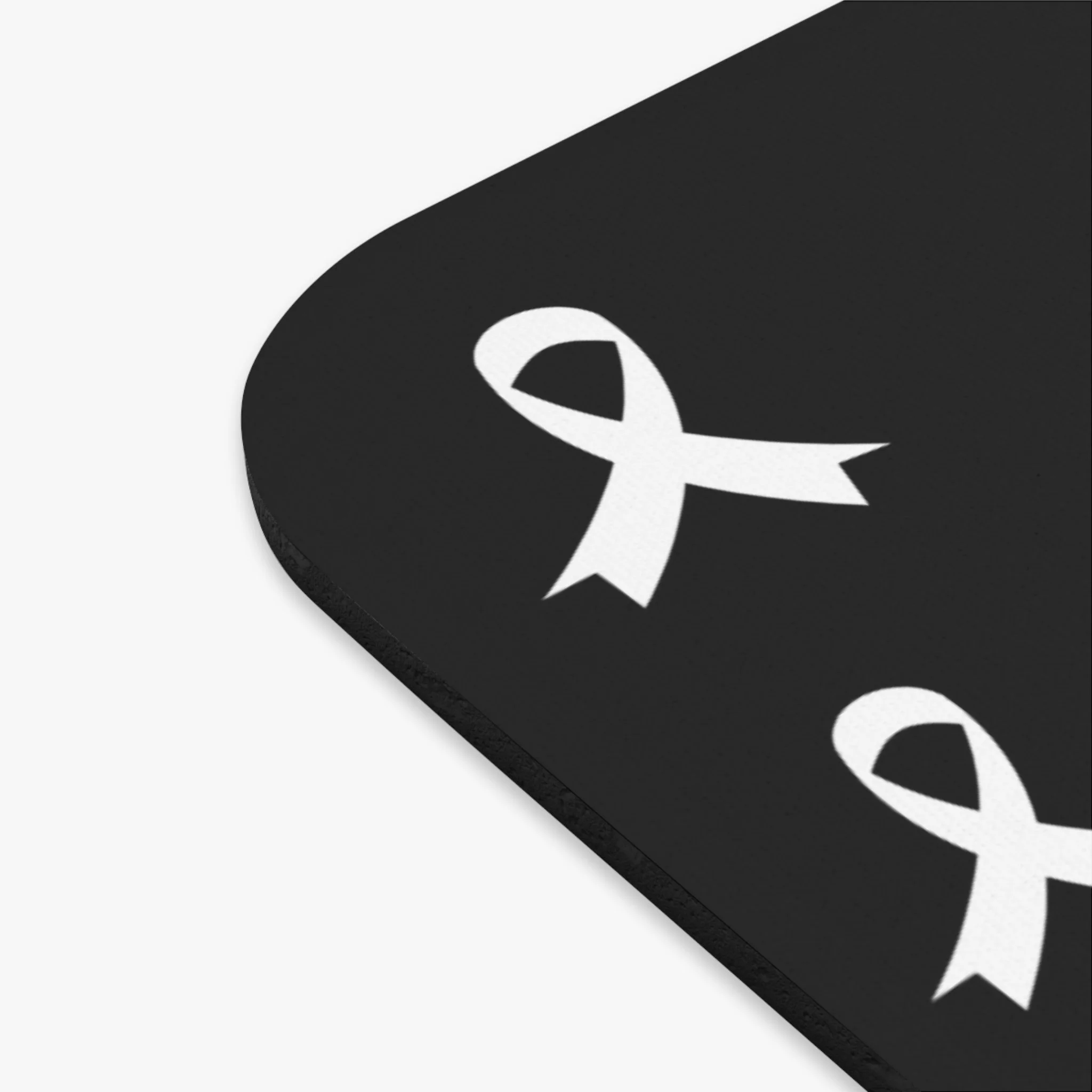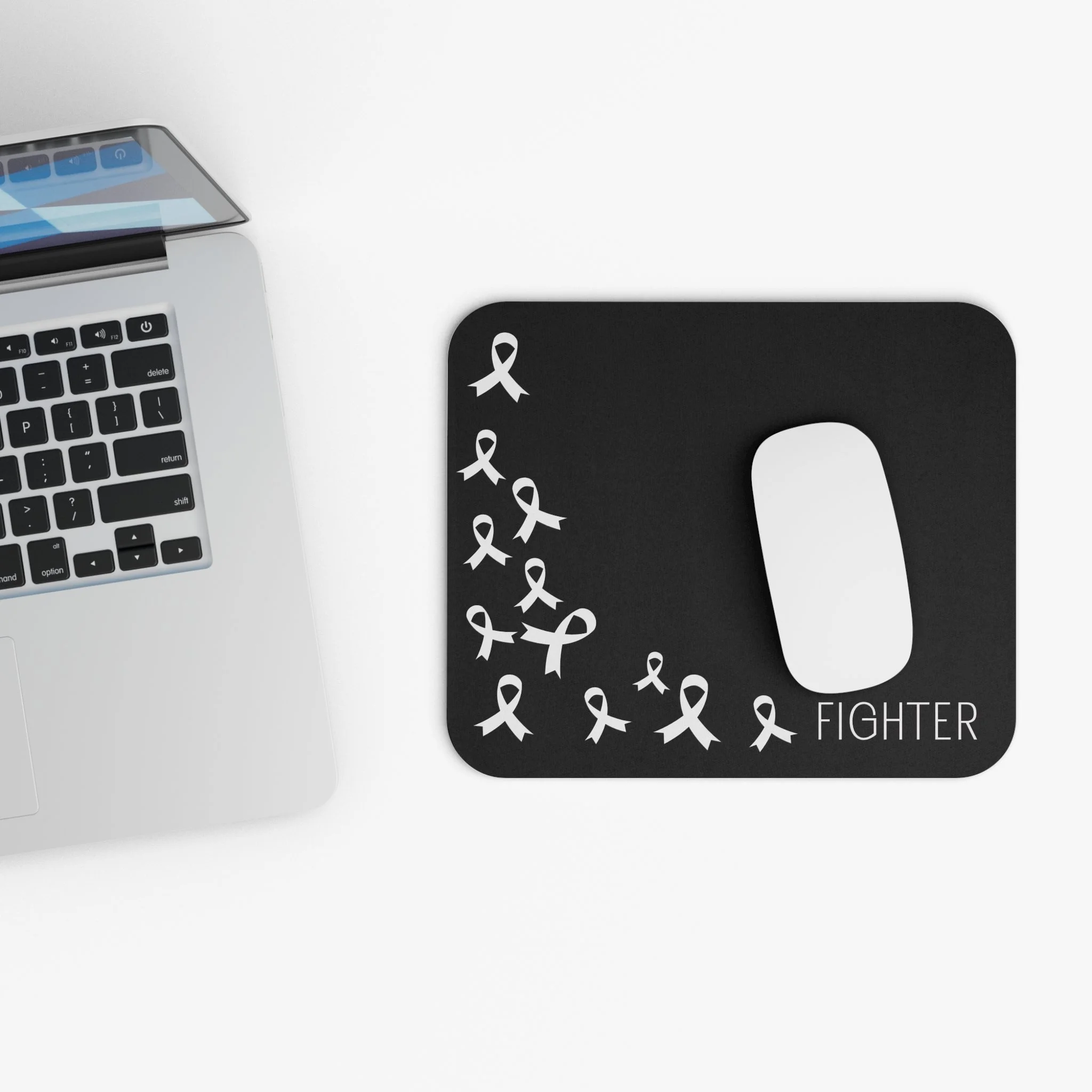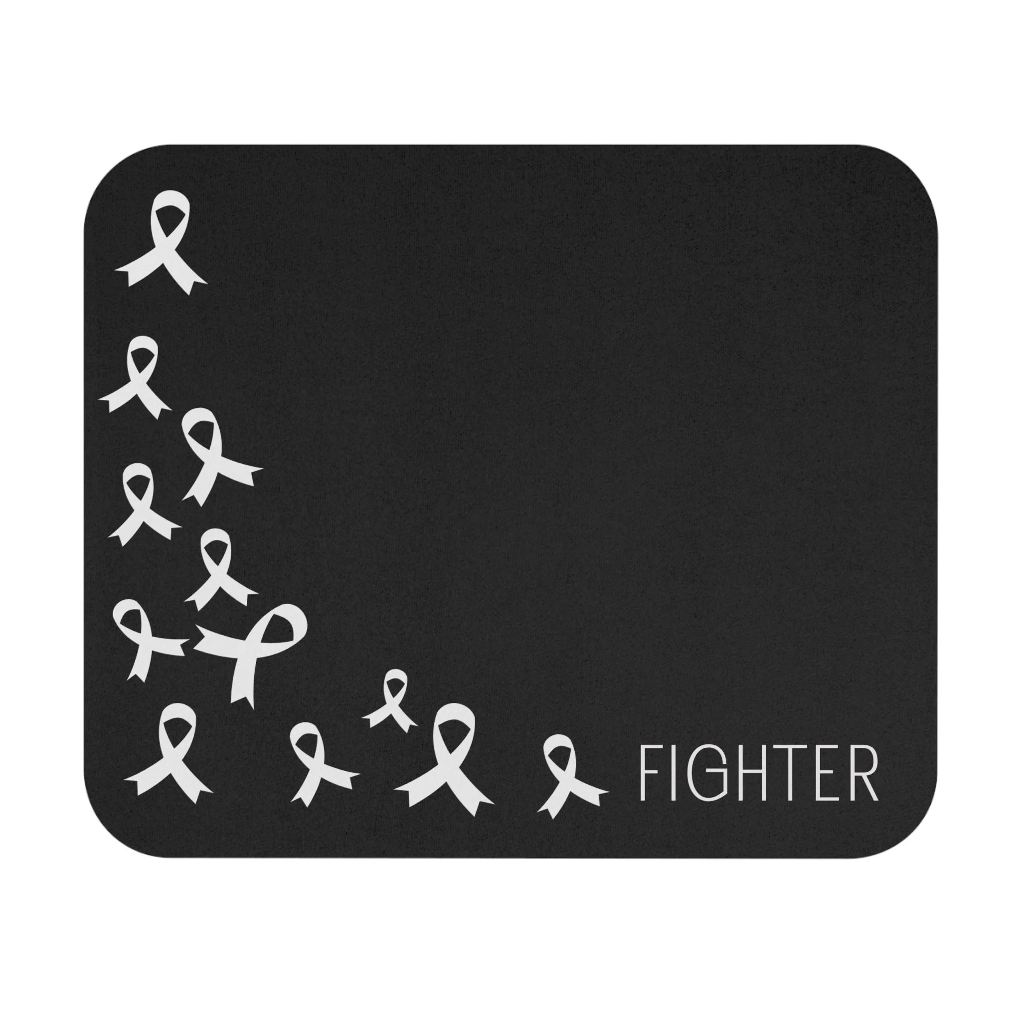 This rectangular mouse pad brings a calm, supportive presence to every click. Matte black canvas hosts a scattering of white awareness ribbons that float from the corner, with the word “FIGHTER” set in clean type. It’s understated and resolute: the smooth surface lets your mouse move without fuss, while the grippy rubber base keeps everything anchored during long work sessions or late-night research. Thin and low-profile, it slips into your setup without demanding attention, yet its message sits there as a small reminder of strength and solidarity whenever you reach for the mouse.