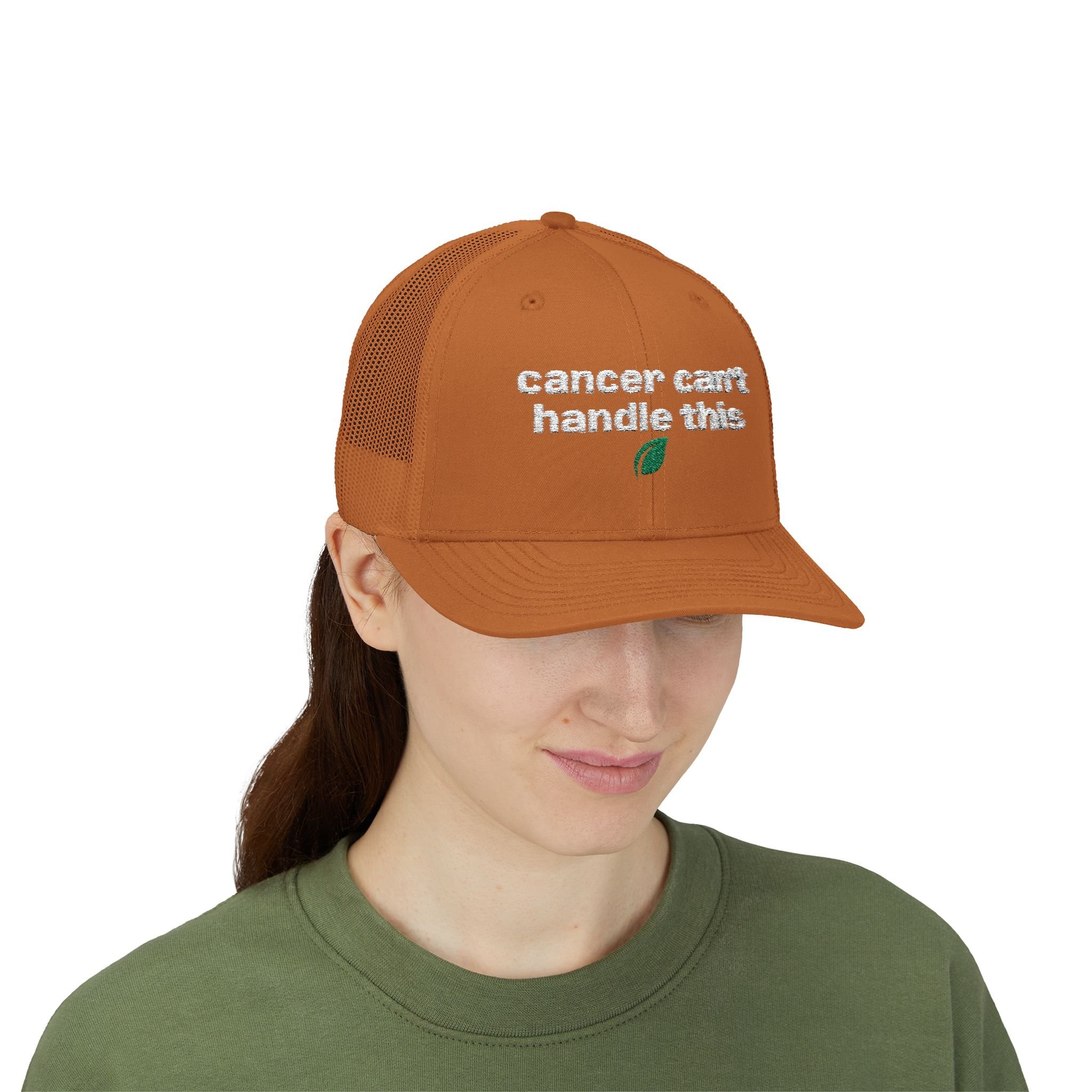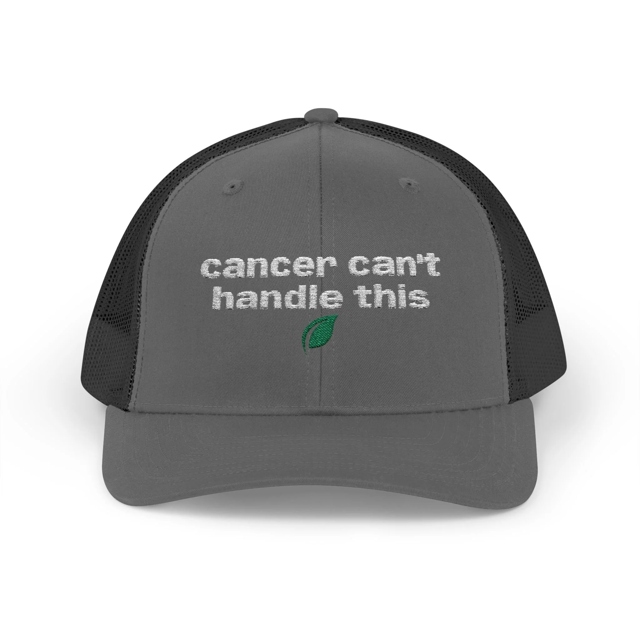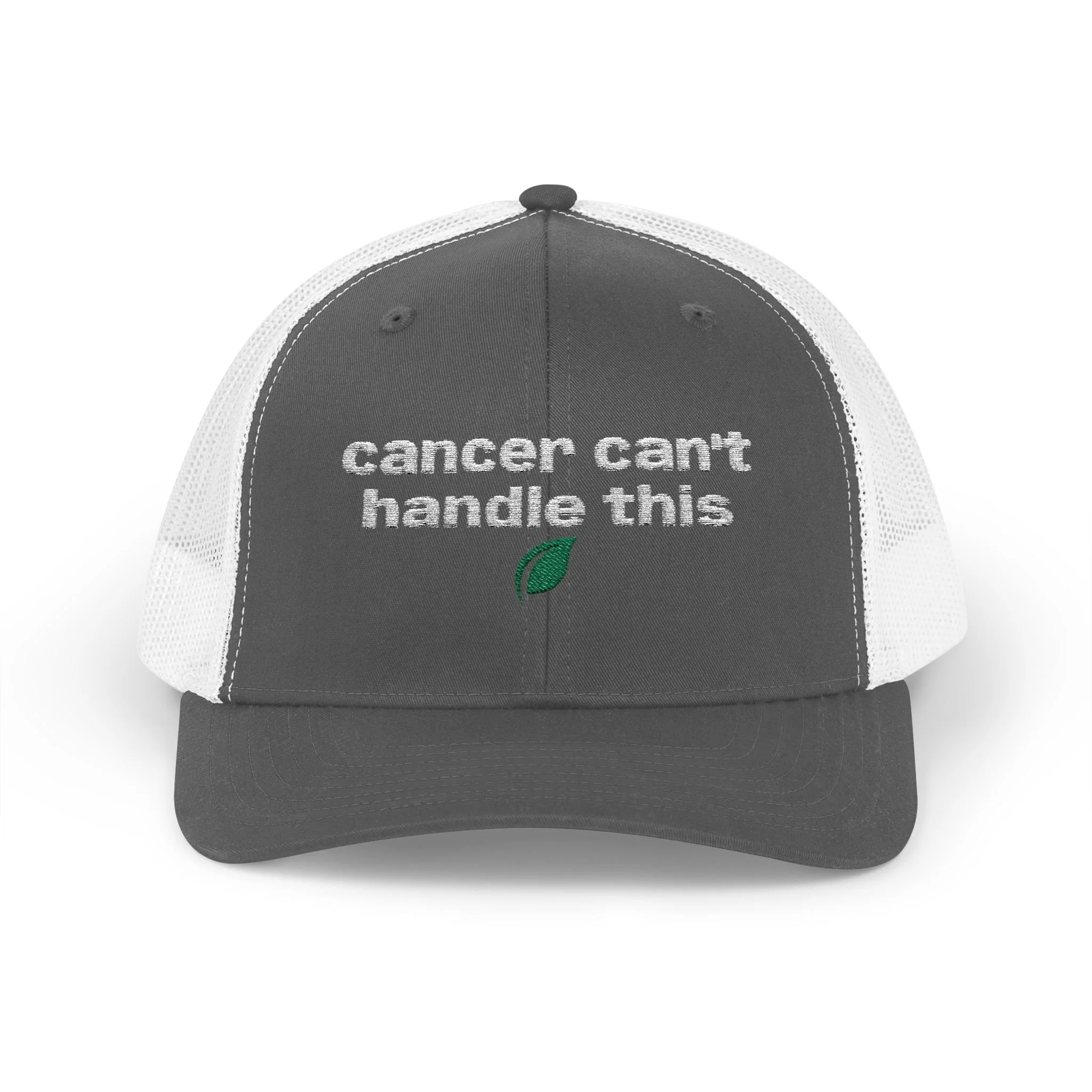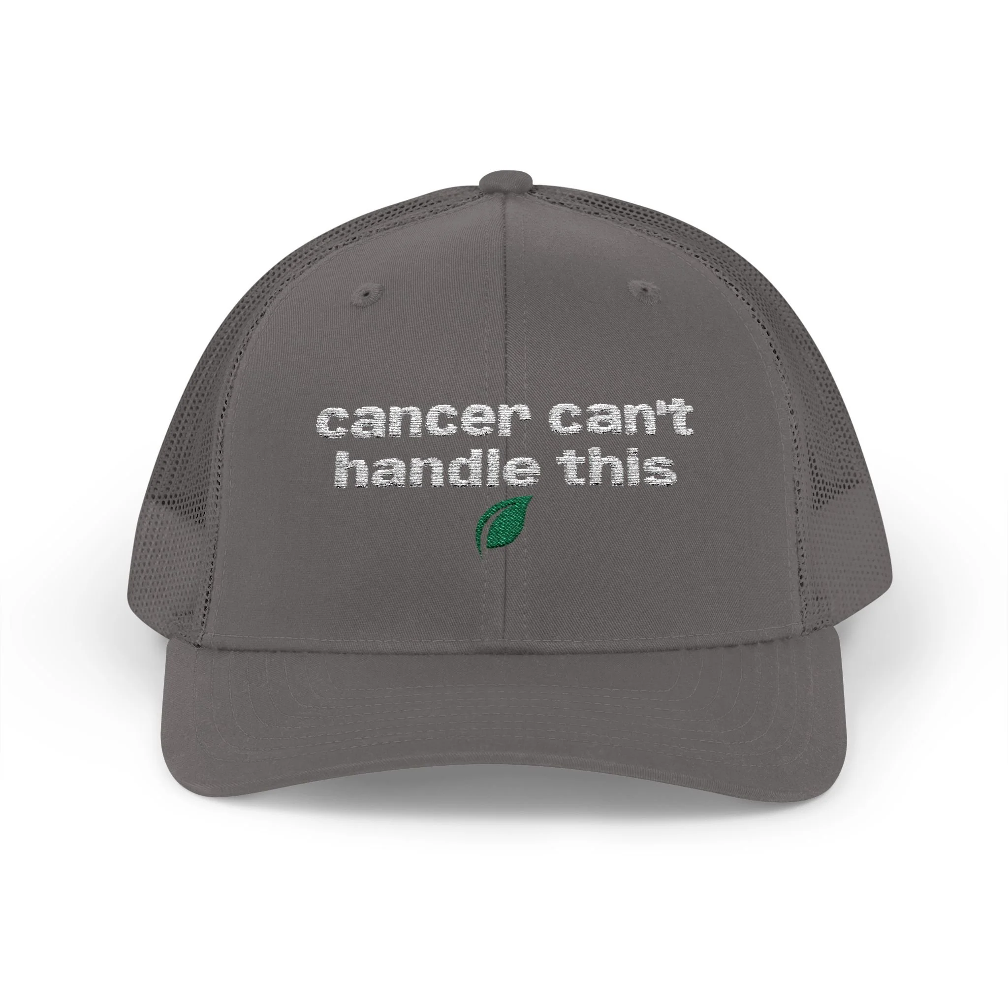 A rugged, everyday trucker cap with an embroidered message across the front. The structured mid-profile crown and hard buckram front keep the silhouette crisp, while the ventilated mesh back and pre-curved Permacurv® visor keep you cool on long days. Slide the adjustable snap to fit and tuck hair through the back. This cap feels lived-in from the moment you put it on.