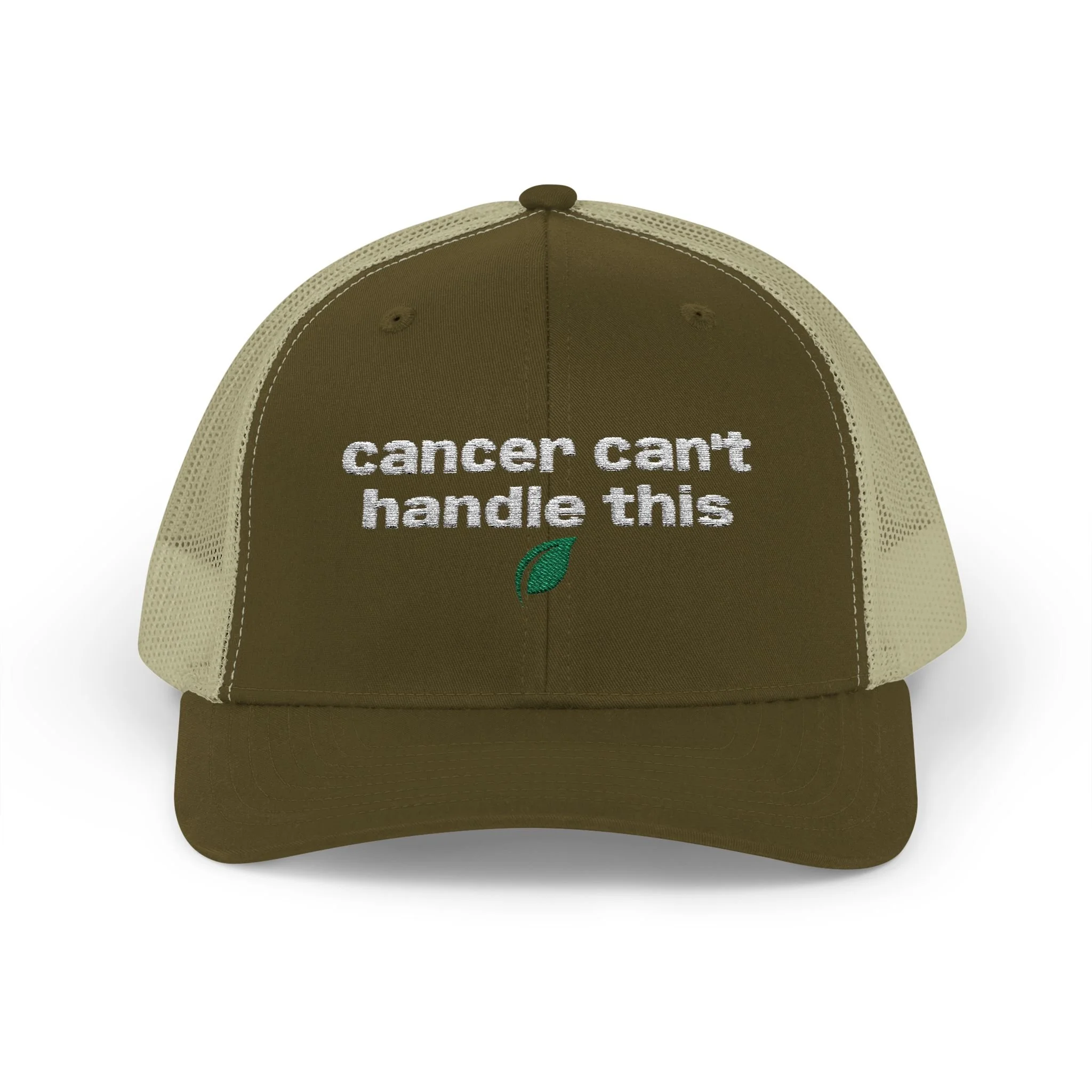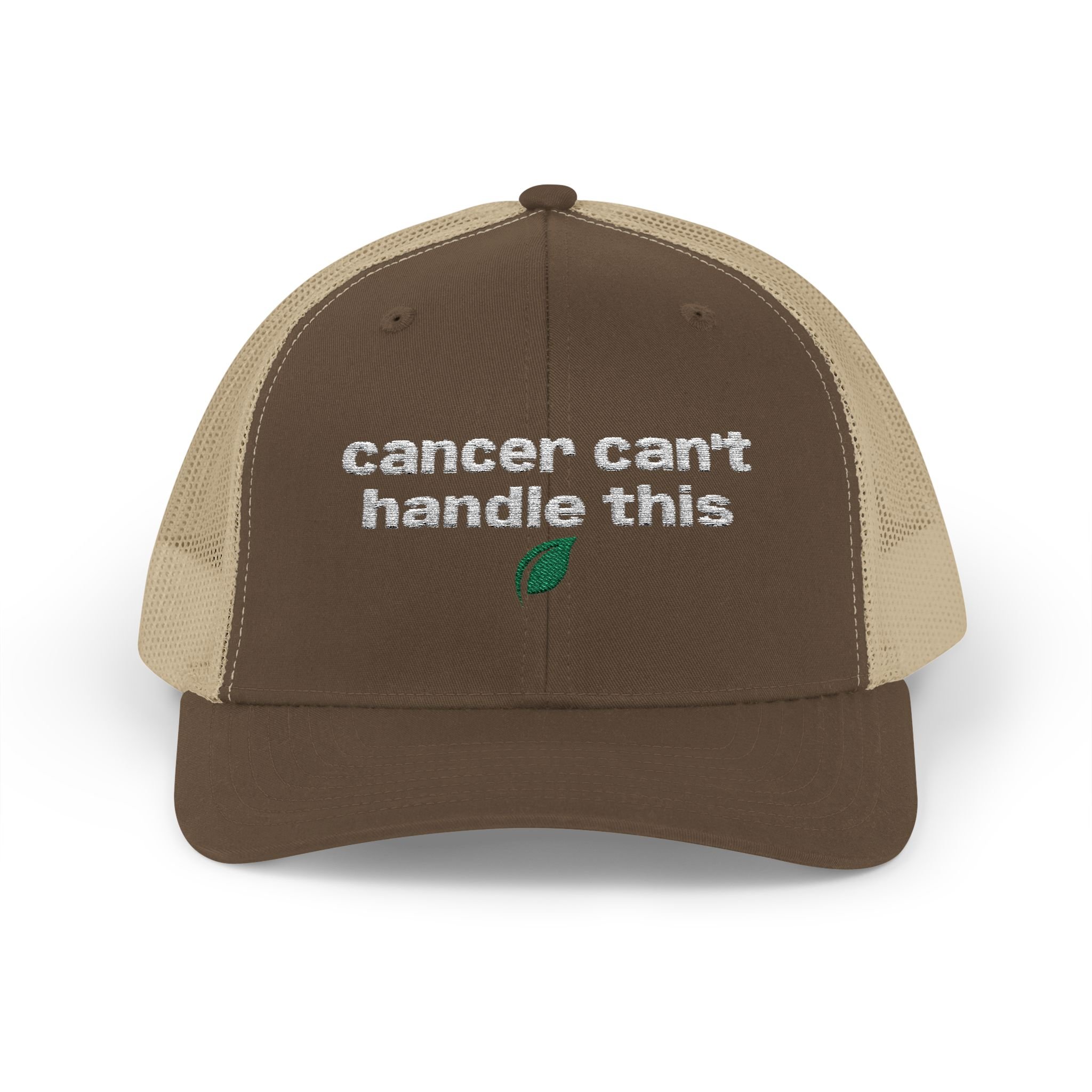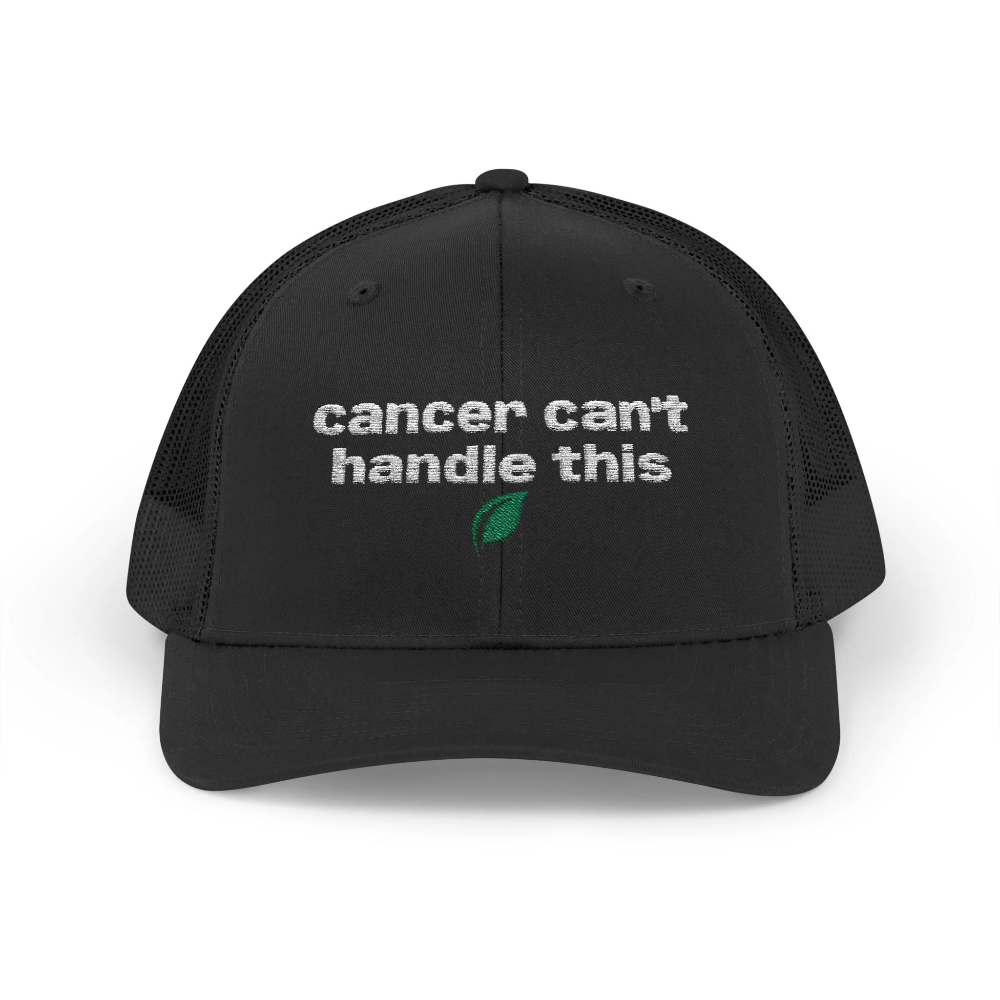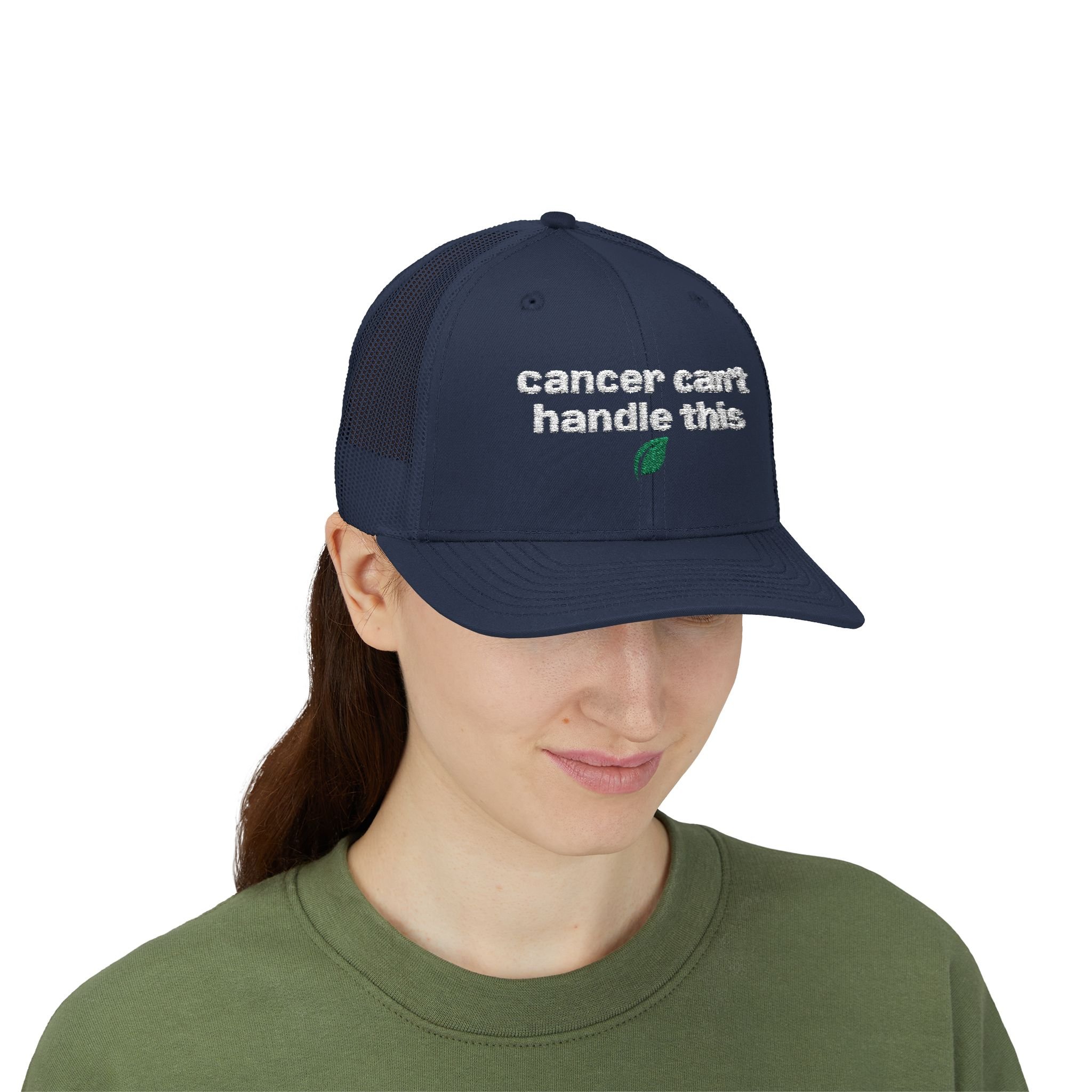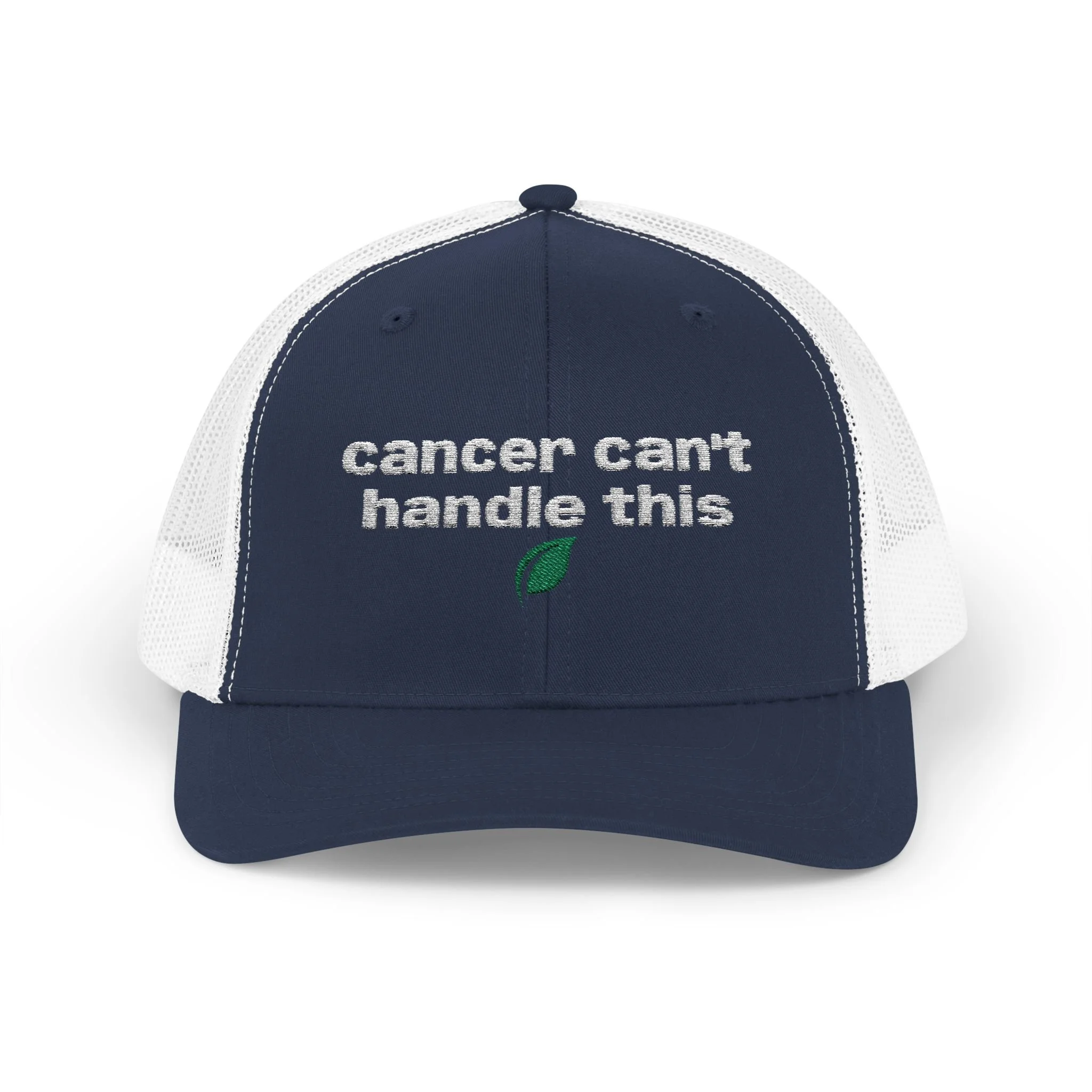 A rugged, everyday trucker cap with an embroidered message across the front. The structured mid-profile crown and hard buckram front keep the silhouette crisp, while the ventilated mesh back and pre-curved Permacurv® visor keep you cool on long days. Slide the adjustable snap to fit and tuck hair through the back. This cap feels lived-in from the moment you put it on.
